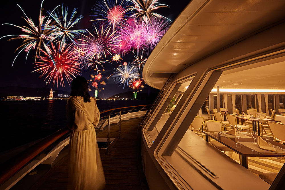 洋上からサマーナイト花火を楽しむ大人気のマリエラクルーズ。ホテルパティシエのスペシャルデザートやドリンクなどを味わいながら、船上から大迫力の花火鑑賞をする贅沢なひとときを。