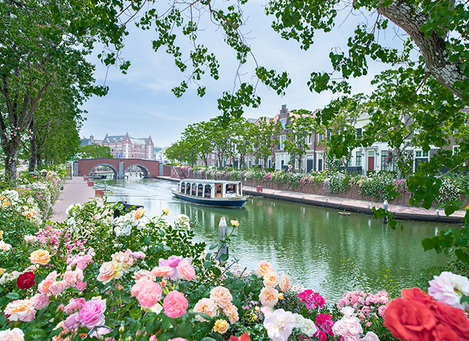 広大なヨーロッパの街並みを彩る色とりどりのチューリップ