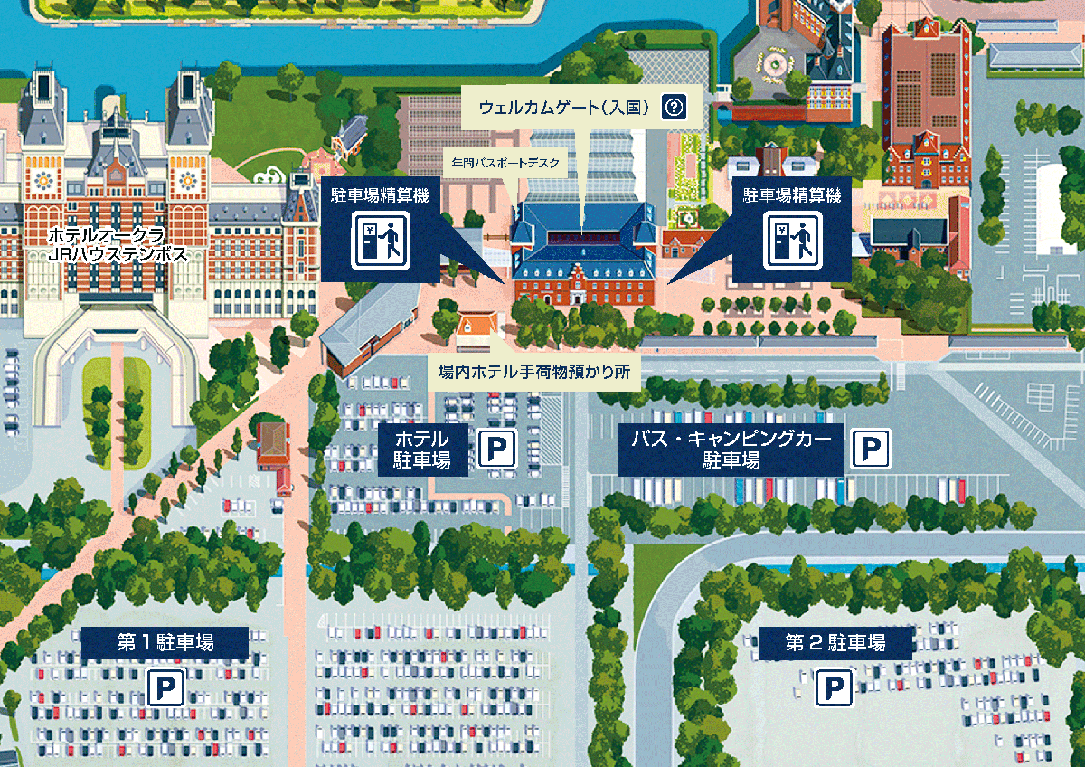 マイカーにてハーバーゾーンを目的にご来場頂く場合、ハウステンボスの「ハーバー駐車場(100円/1時間)」のご利用が可能です。