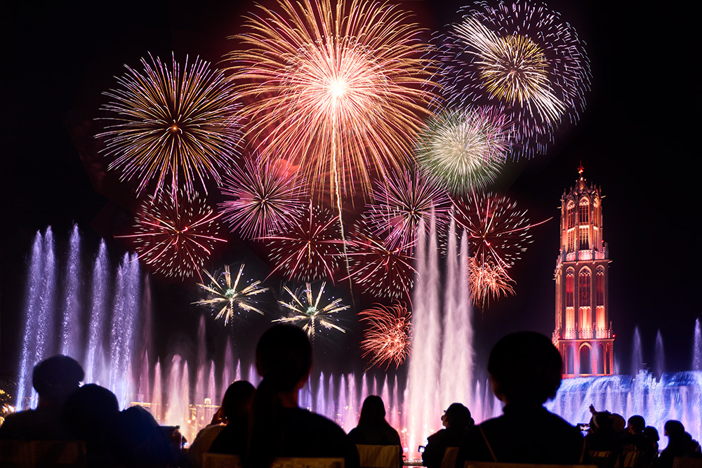 カウントダウン花火としては日本最大規模となる8,000発の花火が夜空を埋め尽くし、ハウステンボス全体が祝祭感に包まれます