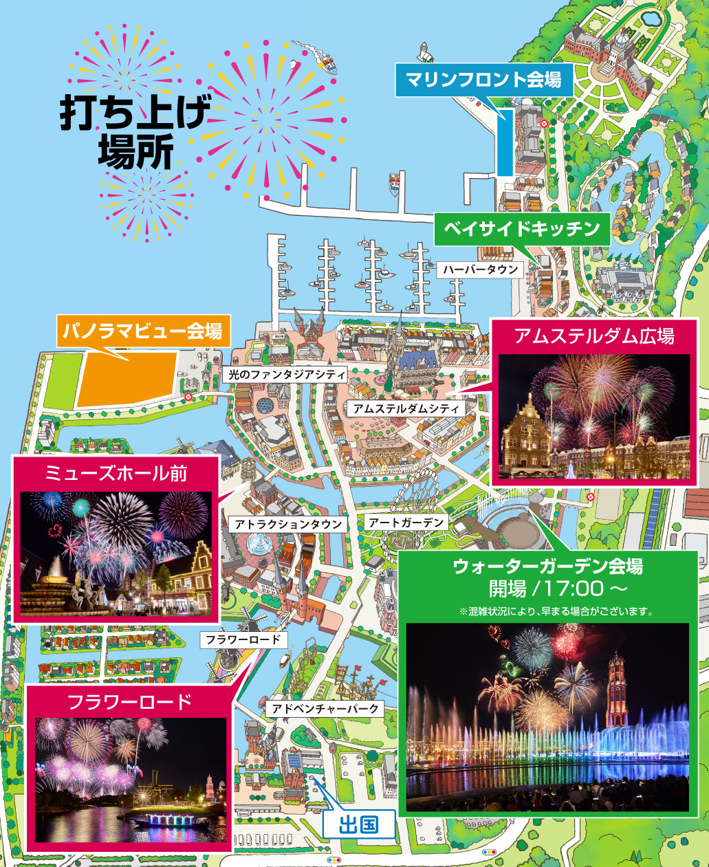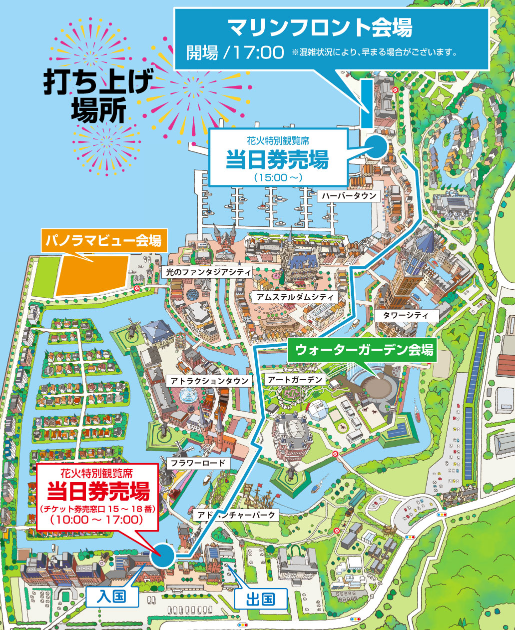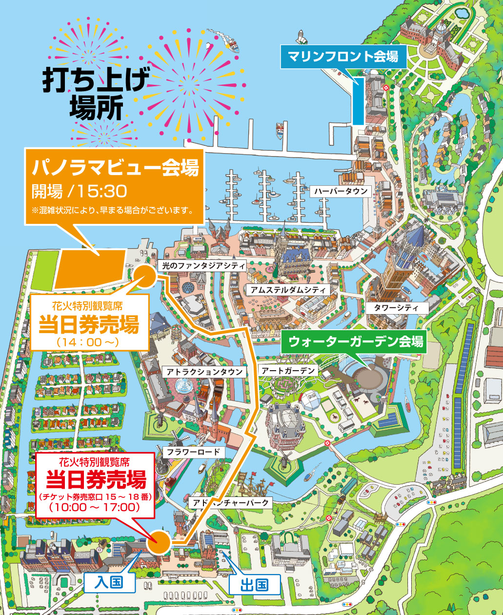 花火開始直前は非常に混雑が予想されます。観覧席へのご移動はお早めにお越しください。