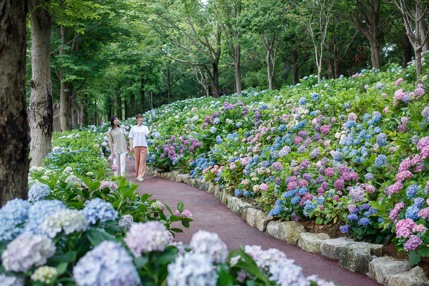 宮殿へと向かう参道では、色や形の異なるあじさいを見比べながら散策を楽しめる。お気に入りをひとつを見つけてみてはいかが。