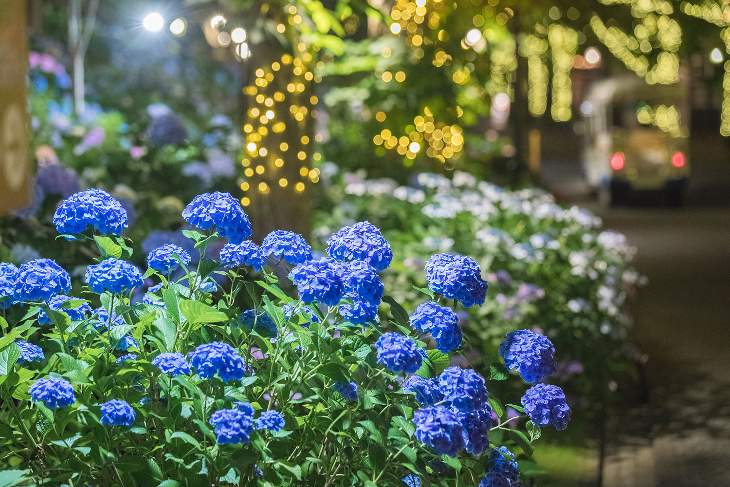 ライトアップされた街並みとともにあじさいも光に照らされ、ロマンティックな世界に様変わり。