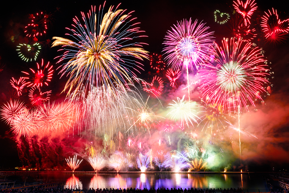 ウィンターソングに合わせて、華やかな花火が聖夜の夜空を彩ります。