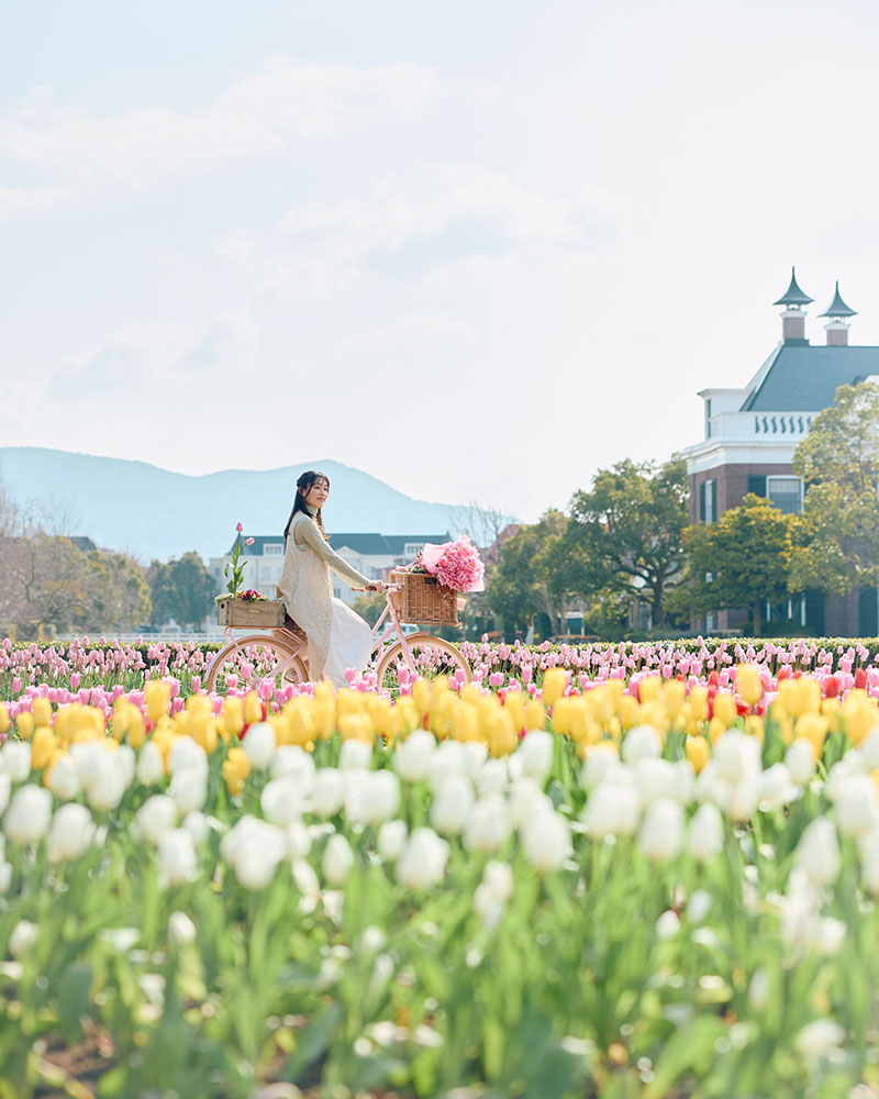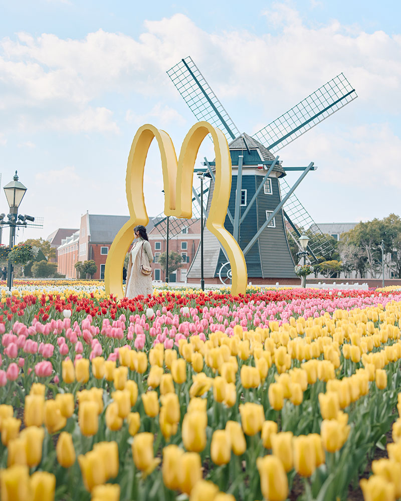 チューリップに囲まれたなかで可愛らしい写真を撮れるフォトスポットが登場。青空と異国情緒の街並みを背景に旅の思い出を撮影しませんか。