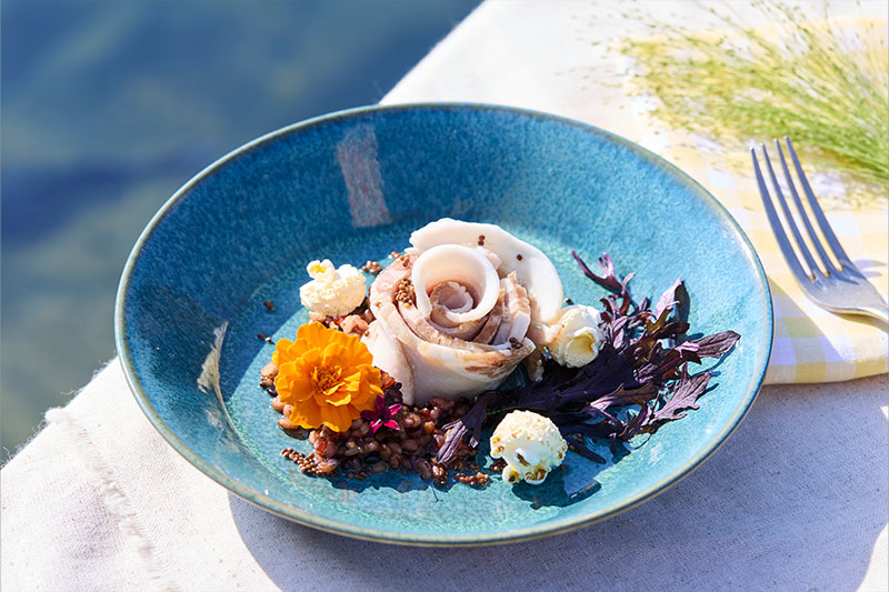 旬の皮目はパリッと身はふっくらと、香ばしいリゾットで食感も楽しめる一皿。