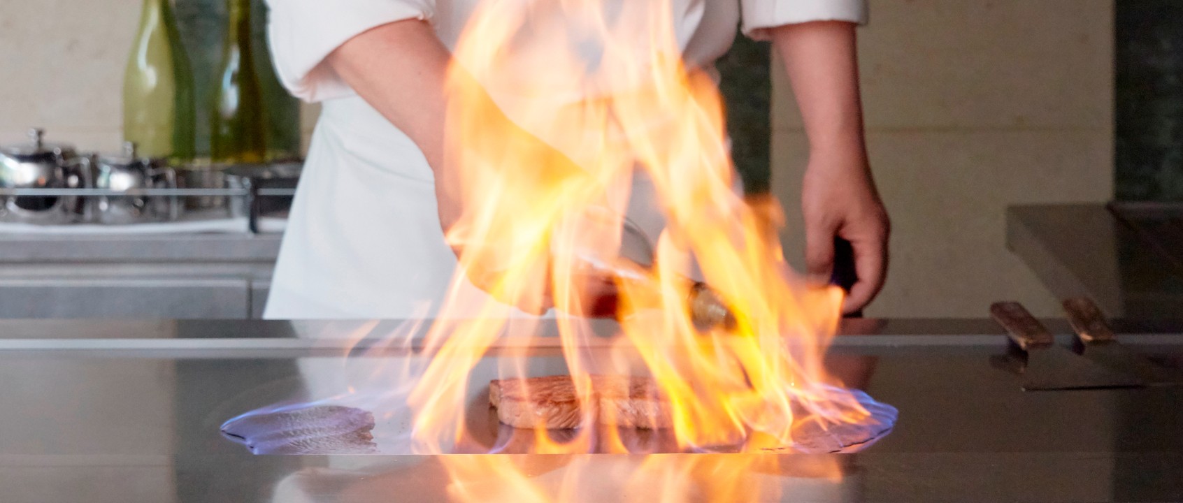 長崎和牛をはじめ、九州各地から取り寄せた厳選素材を鉄板焼きでお楽しみいただけます。焼き加減ひとつで大きく味わいが変わるブランド牛を、熟練の技を持つ職人がお客さまの目の前で丁寧かつダイナミックに調理。至福のひと時と極上の味わいをご堪能いただけます。