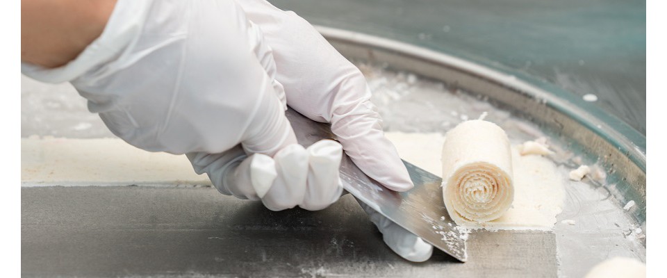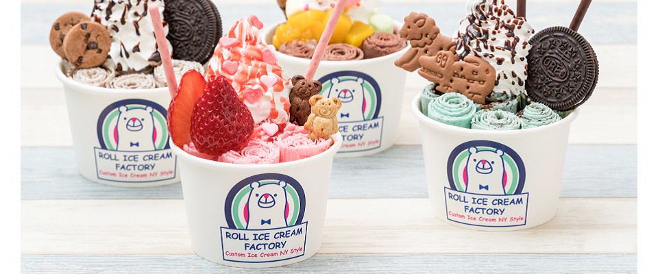 マイナス10℃以下に冷やしたプレートの上でアイスクリームをくるくると巻き上げる様子は、動画に残したくなるほど楽しい時間。ベースとなるアイスクリームやトッピングのスイーツやフルーツ、ソースも自由に選べるので、世界にひとつだけのロールアイスが完成します。