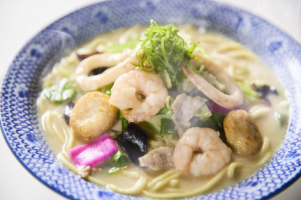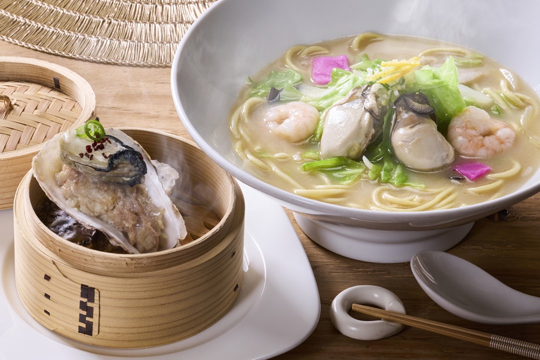 九州産牡蠣の旨味を存分に引き出した、冬限定のおすすめちゃんぽん。肉汁あふれる牡蠣シュウマイとのセットで、贅沢な味わいをお楽しみいただけます。 価格:2,200円