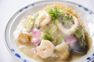 長崎県産の海鮮を使った、身体があたたまるあんかけちゃんぽんです。 ソースを絡めたもちもちのおこげと一緒にお楽しみください。