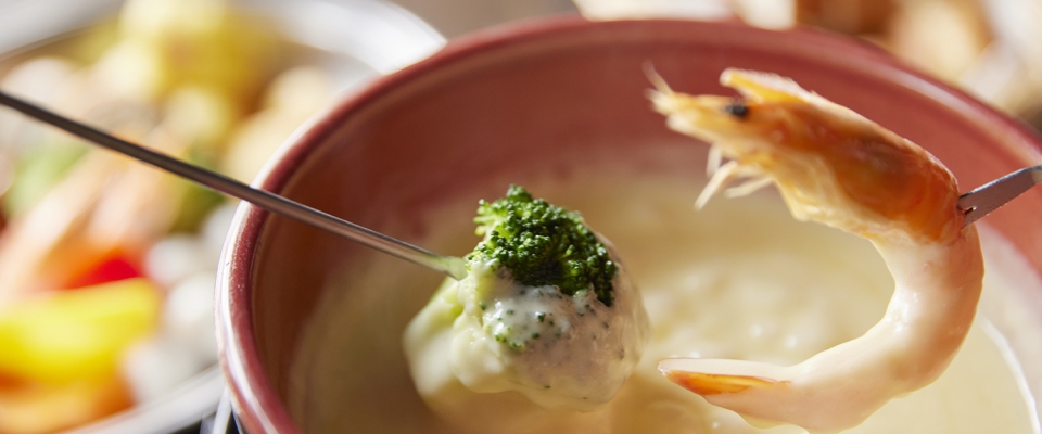 オランダのホールン市のチーズ計量所をモデルにつくられた風情あるチーズワーフ。その2階は本格チーズフォンデュを楽しめるレストランです。エビやホタテや野菜など種類豊富な具材を熱々のスイスチーズにたっぷり絡め、口に運ぶと幸せな気分に。チーズ好きにはおすすめです。