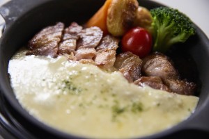 モッツァレラミルクチェリーとたっぷりチーズで焼き、仕上げにデミグラスソースをかけた熱々ドリアです。