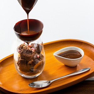 チョコのドームの上からあたたかいチョコソースを降らせるとドームチョコが溶けて、アイスと絡まり絶妙なおいしさ!”映える”チョコパフェ。