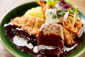 とんかつ・ハンバーグ・エビフライ・ターメリックライス・ナポリタンを盛り合わせたワンランク上のトルコライス。