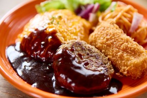 オムライス・ハンバーグ・クリームコロッケ・ナポリタンを盛り合わせた人気のトルコライス。