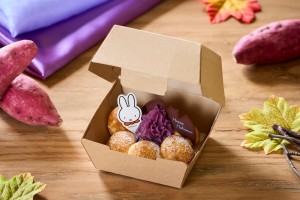 ミッフィーの母国オランダの伝統的なお菓子ポッフェルチェにキャラメルシュガーをトッピング。秋を感じる紫芋ペーストにディップしてお召し上がりください。