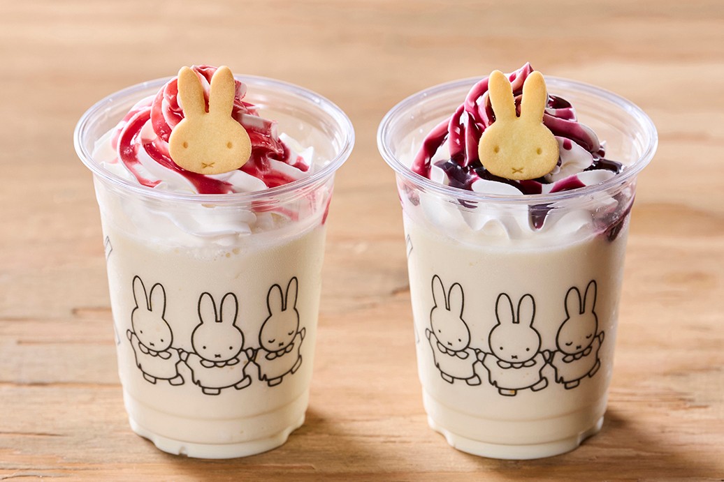 長崎発祥ミルクセーキをベースに生クリームとミッフィークッキーをのせたドリンク。 各700円