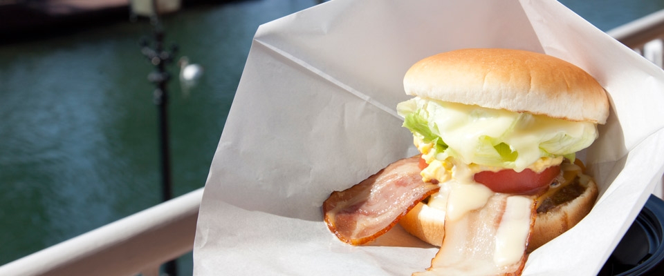 佐世保バーガーをはじめ、本格的カフェドリンクやソフトクリーム、季節限定のドリンクなど、運河を眺めながら屋外のデッキでお楽しみいただけます。