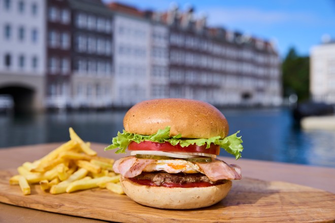 運河のほとりで街並みを眺めながら、佐世保バーガーを堪能