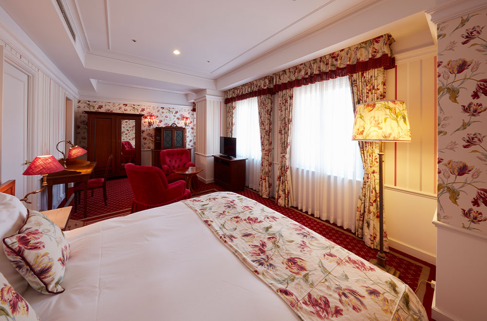 ヨーロッパの重厚感ある調度品で設え、ベッドサイズはセミダブルクラスと、