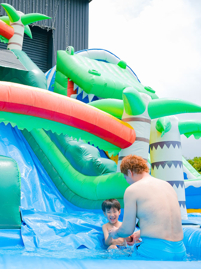 大きな流れるプールのほかに、ベビープールや子ども向け(小学生以上)のエアースライダーもあるので、未就学児や小学校低学年の子どもと一緒に全力で楽しめます。1時間に10分の休憩タイムも親としてありがたい♡