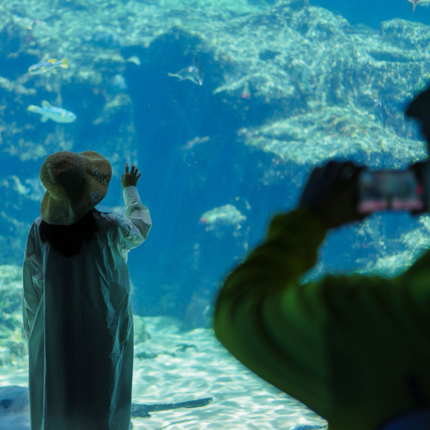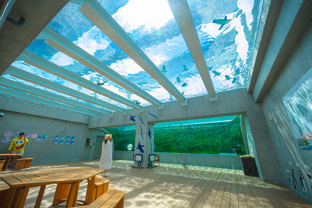 見ているだけで涼しげな〈ペンギン館〉は、なんと日本最大級の天井水槽と日本初の極浅水槽を備えた超新感覚の展示施設なんです。