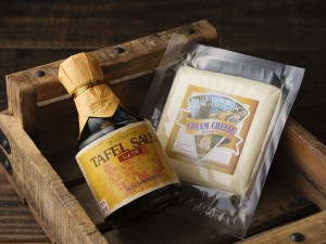 ハウステンボスを代表するチーズ商品。長崎の特産あご出汁を使用した出汁醤油とロングセラーのクリームチーズのセットです。サイコロ状にカットして冷奴風に。